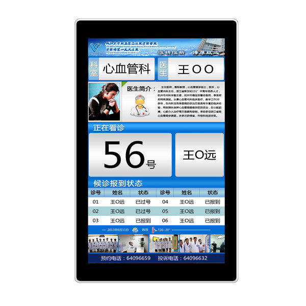 3、在每個(gè)掛號(hào)窗口配置一個(gè)中型或小型的壁掛式海報(bào)機(jī),可用于顯示掛號(hào)收費(fèi)信息、當(dāng)日出診專(zhuān)家介紹、掛號(hào)排隊(duì)信息等;