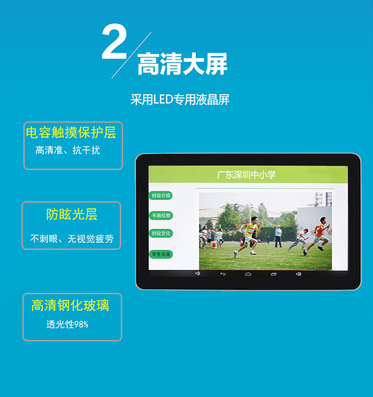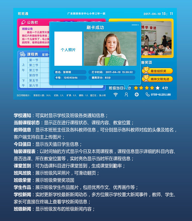 基礎數據庫系統是按照教育行業設計的標準數據庫,包括學校信息、教師信息、教室信息、學生信息、課程信息、班風班貌、德育評價、考試信息、考勤信息等,通過建設基礎數據庫系統可為教育信息化建設打造堅實基礎。產品備注:電容觸摸,可選擇帶刷卡功能或不帶刷卡功能,備貨尺寸:15.6寸、18.5寸、21 5寸,其他尺寸可訂做。