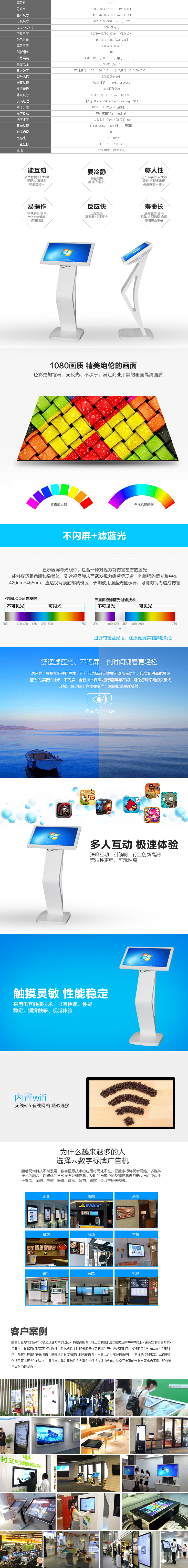 產品的多功能特性: 1、電腦功能:可坐在10米之內上網,可以用無線鍵盤鼠標,無線上網,同時配有無線的手寫板。(可適用于家庭、單位、工廠、公司) 2、觸摸功能:配備全球最先進的第六代全新紅外多點觸摸屏---流暢的觸摸體驗! 3、卡拉OK功能:擁有KTV點唱功能,即點即唱,娛樂方便。(適用于家庭或單位聚會) 4、免費可視電話功能:可以接入光纖寬帶進行視屏電話,無論國內國外,省內省外,本地外地,無需昂貴的電話費用。(適用于家庭、企業、公共場所) 5、電玩功能:可以當一部電玩,可接入手柄、方向盤、搖桿、跳舞毯,進行賽車、射擊、斗地主、魔獸世界、夢幻西游、三國演義等電子游戲。(適用于家庭、游戲娛樂場所) 6、會議功能:可做會議演講、策劃方案講解、遠程視屏會議,電子文檔即插即用,無需投影儀、投影幕布、電腦、幻燈片展示臺、DVD播放器等多余設備。 7、環保白板功能:隨便寫,隨便畫,無需筆擦,而且環保。用筆用手都可以書寫,可以隨便刪除,也可以儲存、錄制。(適用于學校、培訓機構、酒店會議室、政府各機關單位、或企業內訓、保險公司、證劵公司…) 8、投影儀功能:“觸動視界”大屏幕可代替投影儀,播放大屏顯示文件,并且圖像更加清晰。(適用于酒店會議室、政府各機關單位、或公司工廠開會、學校、培訓機構、保險公司、證劵公司…) 9、導購機功能:具有導購、導示功能,給與顧客指引,方便顧客查找自己所需的產品,并帶有廣告宣傳等附加功能(適用于商場超市、醫院、圖書館、酒店、展覽館、批發商城等) 10、電子查詢功能:通過運營商對各種電子文件、信息的輸入和編輯,顧客可以自助查詢到所需要的信息,減低問詢的人員成本。(適用于電信、圖書館、醫院等公共場所) 11、視頻監控功能:可以對監視區域的安全監控,任意調出各個區域的實況視頻,進行數據分析。(適用于學校考場監控、安防監控、公安監控等)