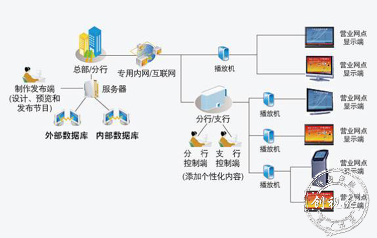 該項目將覆蓋全市多個營業網點,以市分行為中心建立中心管理平臺,各網點建立信息發布終端。項目以創視紀系統為核心,整合LED門楣屏、叫號系統、銀行內部業務數據系統、ATM終端,分別安置在營業網點大廳、區域,即時播放建行業務宣傳、匯率、利率、基金凈值、黃金行情、債券行情等實時金融數據以及天氣預報、業務通知公告等節目信息。