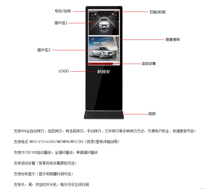 同時,它還具有大量存儲信息的功能,能夠及時的更新或調整信息,有效的滿足顧客的需求,現創視紀在大量生產落地式廣告機,已有多家合作客戶,批量訂購我們的廣告機,尺寸均可定制,歡迎前來選購。